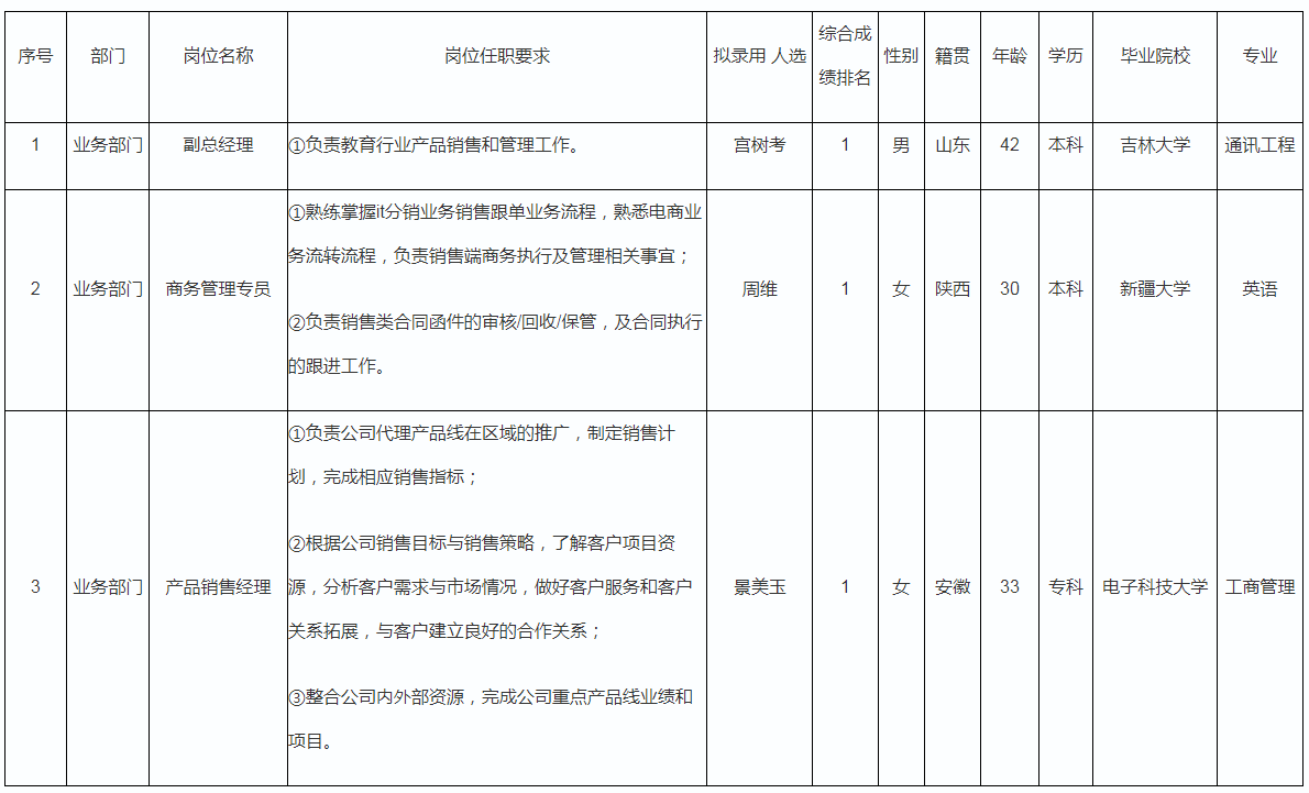 根據(jù)四川長虹佳華信息產(chǎn)品有限責(zé)任公司發(fā)布的招聘公告及招聘相關(guān)規(guī)定,經(jīng)筆試、面試、考察、體檢等程序,擬錄用宮樹考、周維、景美玉同志到四川長虹佳華信息產(chǎn)品有限責(zé)任公司工作,現(xiàn)予以公示,具體情況如下: