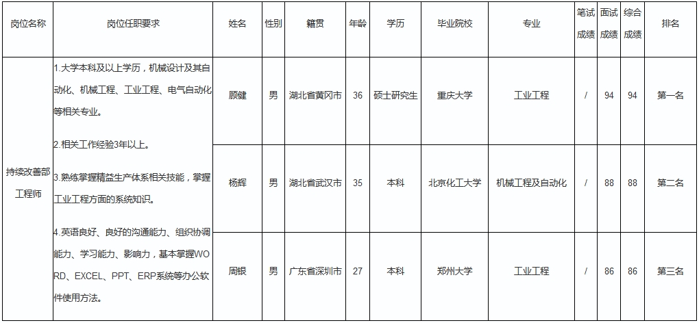 四川波鴻實(shí)業(yè)有限公司關(guān)于招聘威斯卡特工業(yè)(中國(guó))有限公司持續(xù)改善部工程師成績(jī)的公示