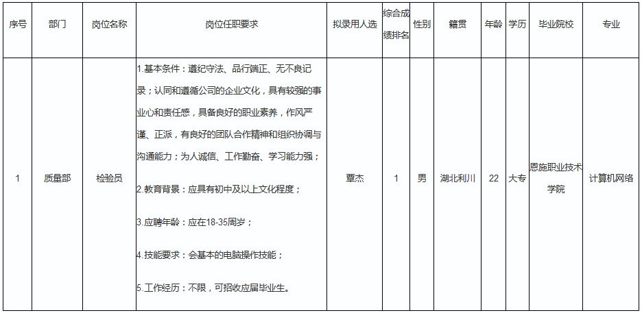 根據(jù)武漢九州芯技術有限公司發(fā)布的招聘公告及招聘相關規(guī)定,經(jīng)面試、考察、體檢等程序,擬錄用覃杰同志到武漢九州芯技術有限公司工作,現(xiàn)予以公示,具體情況如下:
