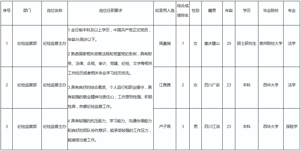 根據(jù)四川長(zhǎng)虹電子控股集團(tuán)有限公司發(fā)布的招聘公告及招聘相關(guān)規(guī)定,經(jīng)面試、考察等程序,擬錄用周晨瑞、江茜茜、盧子昂三位同志到長(zhǎng)虹控股集團(tuán)紀(jì)檢監(jiān)察部工作,現(xiàn)予以公示,具體情況如下: