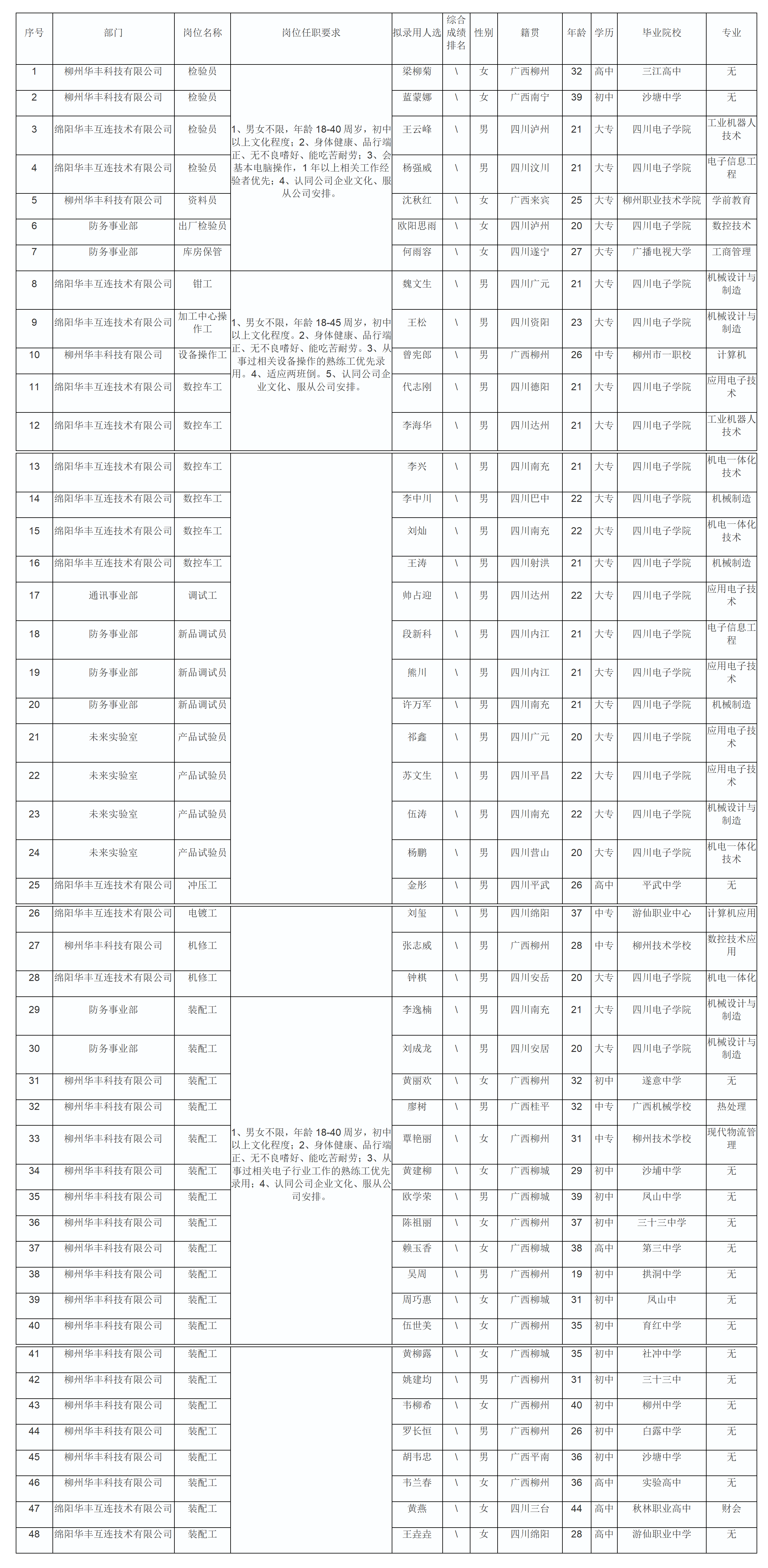 根據四川華豐科技股份有限公司發(fā)布的招聘公告及招聘相關規(guī)定,經面試、考察、體檢等程序,擬錄用以下48人到四川華豐科技股份有限公司工作,現(xiàn)予以公示,具體情況如下:
