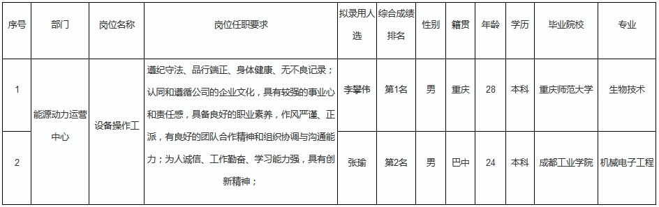 根據(jù)四川長虹電器股份有限公司發(fā)布的招聘公告及招聘相關(guān)規(guī)定,經(jīng)筆試、面試、考察、體檢等程序,擬錄用李攀偉等同志到能源動力運營中心工作,現(xiàn)予以公示,具體情況如下: