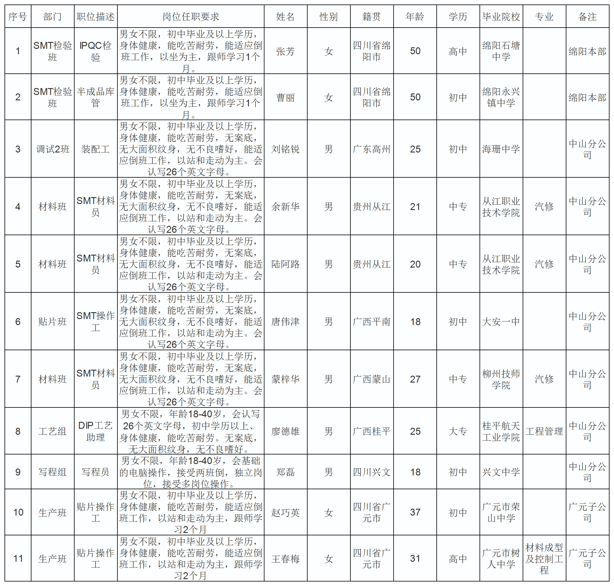根據(jù)四川長虹精密電子科技有限公司發(fā)布的操作職招聘公告及招聘相關(guān)規(guī)定,從2023年11月1日至2023年11月30日經(jīng)面試、考察、體檢等程序,錄用以下11位同志到四川長虹精密電子科技有限公司操作職崗位工作,現(xiàn)予以公示,具體情況如下: