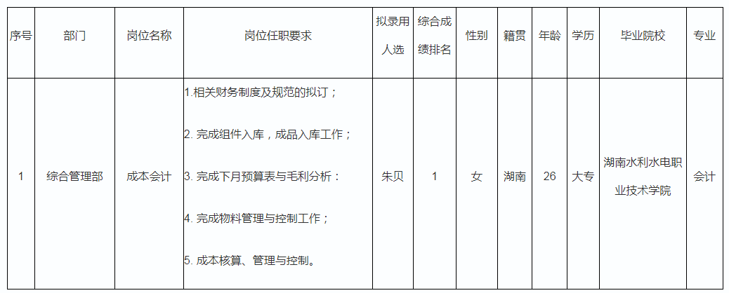 根據(jù)廣東長虹器件科技有限公司發(fā)布的招聘公告及招聘相關(guān)規(guī)定,經(jīng)筆試、面試、考察、體檢等程序,擬錄用朱貝同志到廣東長虹器件科技有限公司工作,現(xiàn)予以公示,具體情況如下: