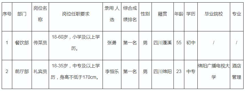 根據(jù)綿陽富樂山九洲國際酒店有限公司發(fā)布的招聘公告及招聘相關(guān)規(guī)定,經(jīng)面試、體檢等程序,錄用張勇、李恒樂2名同志到餐飲部、前廳部工作,現(xiàn)予以公示,具體情況如下: