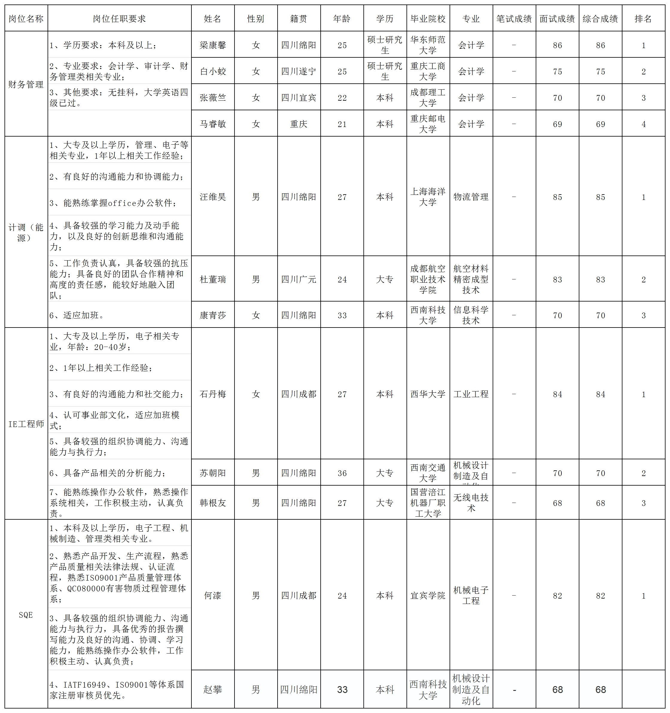 根據(jù)四川九州電子科技股份有限公司發(fā)布的招聘公告及招聘相關(guān)規(guī)定,經(jīng)筆試、面試等程序,現(xiàn)將筆試(面試)成績予以公示。