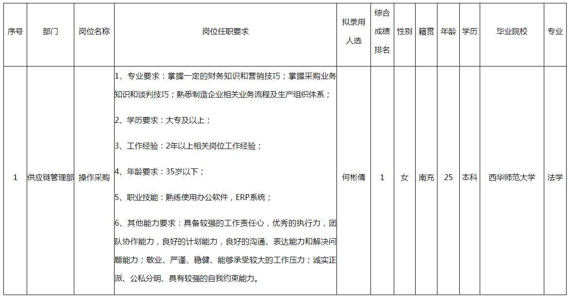 根據(jù)四川愛創(chuàng)科技有限公司發(fā)布的招聘公告及招聘相關(guān)規(guī)定,經(jīng)面試、考察、體檢等程序,擬錄用何彬倩同志到供應(yīng)鏈管理部工作,現(xiàn)予以公示,具體情況如下: