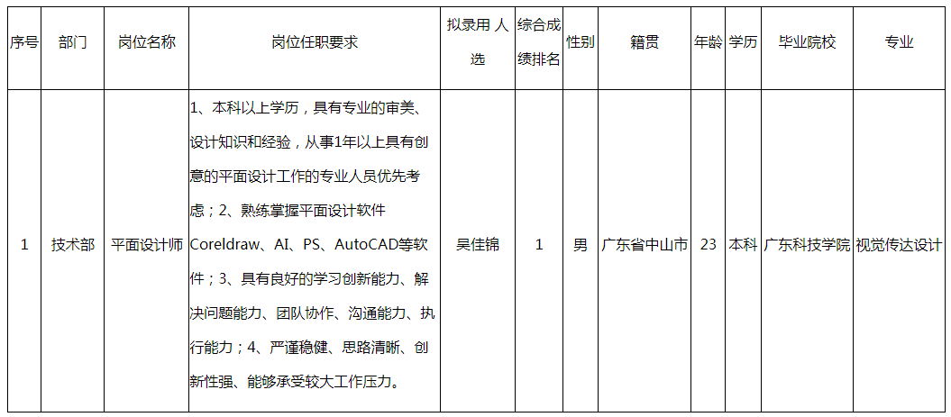 根據(jù)中山長虹電器有限公司發(fā)布的招聘公告及招聘相關規(guī)定,經面試、考察、體檢等程序,擬錄用吳佳錦同志到平面設計師工作,現(xiàn)予以公示,具體情況如下: