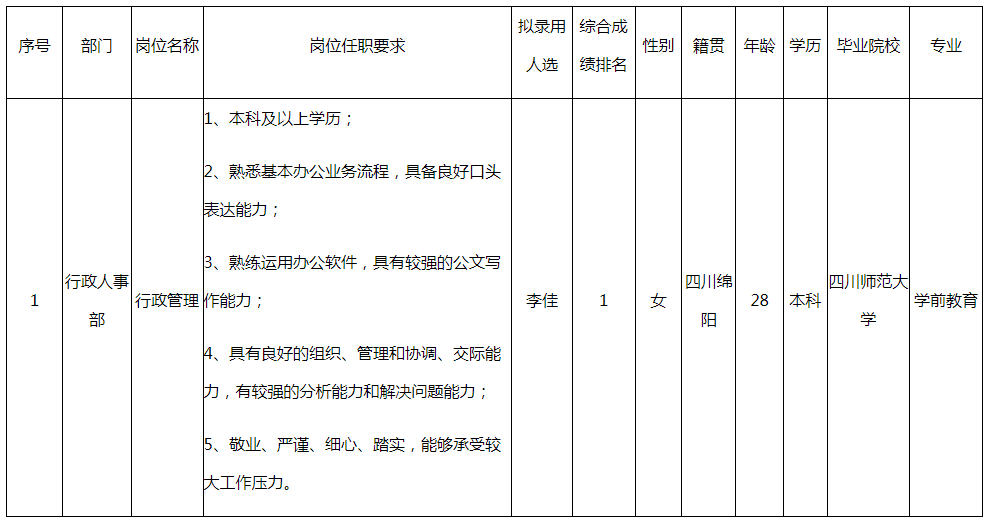 根據(jù)四川長虹空調(diào)有限公司發(fā)布的招聘公告及招聘相關(guān)規(guī)定,經(jīng)面試、考察、體檢等程序,擬錄用李佳到長虹空調(diào)工作,現(xiàn)予以公示,具體情況如下: