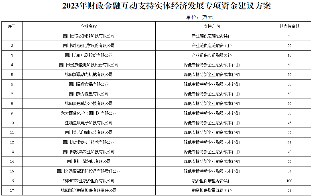 按照《關(guān)于印發(fā)<綿陽市2023年財(cái)政金融互動支持實(shí)體經(jīng)濟(jì)發(fā)展專項(xiàng)資金申報(bào)指南>的通知》(綿金發(fā)〔2023〕18號)要求,通過企業(yè)自主申報(bào)、縣(市、區(qū))、園區(qū)工業(yè)經(jīng)濟(jì)主管部門和財(cái)政部門聯(lián)合初審?fù)扑],經(jīng)市經(jīng)信局會同市財(cái)政局、中國人民銀行綿陽分行聯(lián)合會審、專家評審、現(xiàn)場核查以及市經(jīng)信局黨組會審議等程序,現(xiàn)對2023年財(cái)政金融互動支持實(shí)體經(jīng)濟(jì)發(fā)展專項(xiàng)資金擬支持的17戶企業(yè)予以公示。