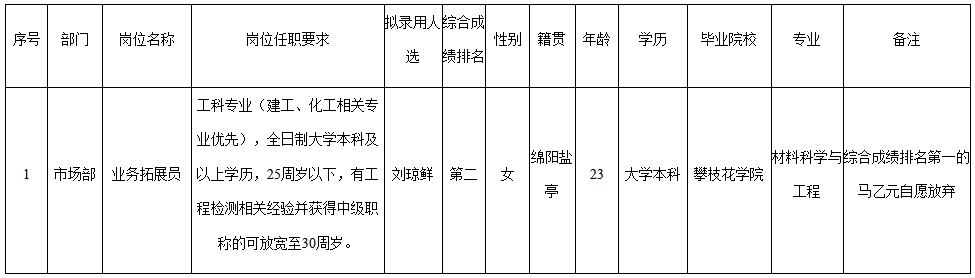 根據(jù)綿陽(yáng)市建設(shè)工程質(zhì)量檢測(cè)中心有限責(zé)任公司發(fā)布的招聘公告及招聘相關(guān)規(guī)定,經(jīng)筆試、面試、背景調(diào)查、體檢等程序,擬錄用劉瓊鮮同志到綿陽(yáng)市建設(shè)工程質(zhì)量檢測(cè)中心有限責(zé)任公司工作,現(xiàn)予以公示,具體情況如下:
