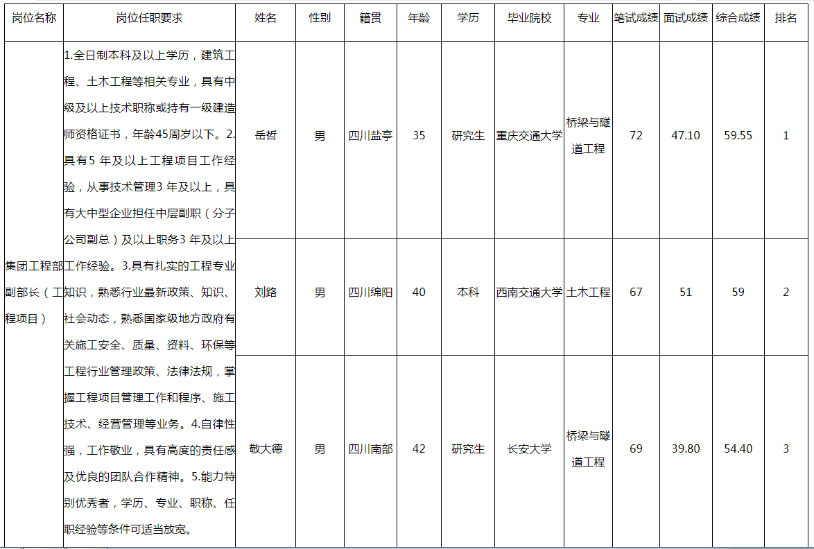 根據(jù)綿陽市國資委發(fā)布的面向全國選聘20名國企經(jīng)營管理人員的公告及相關(guān)規(guī)定,對11個達到開考比例的崗位應聘人員組織能力測試、面試(另有9個崗位未達到開考比例終止競聘),現(xiàn)將各應聘人員成績予以公示。