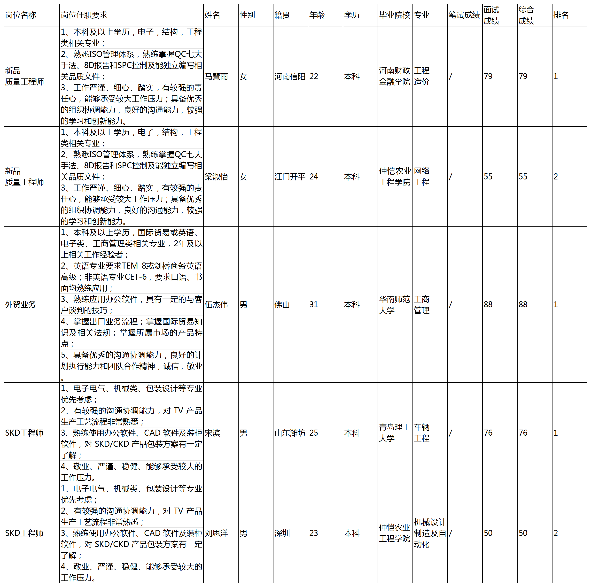 根據(jù)廣東長虹電子有限公司發(fā)布的招聘公告及招聘相關(guān)規(guī)定,經(jīng)面試等程序,現(xiàn)將面試成績予以公示。