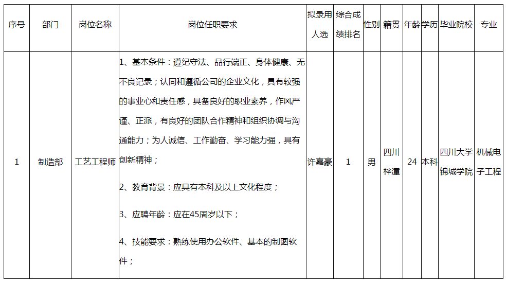 根據(jù)四川長(zhǎng)虹空調(diào)有限公司發(fā)布的招聘公告及招聘相關(guān)規(guī)定,經(jīng)面試、考察、體檢等程序,擬錄用許嘉豪到長(zhǎng)虹空調(diào)工作,現(xiàn)予以公示,具體情況如下: