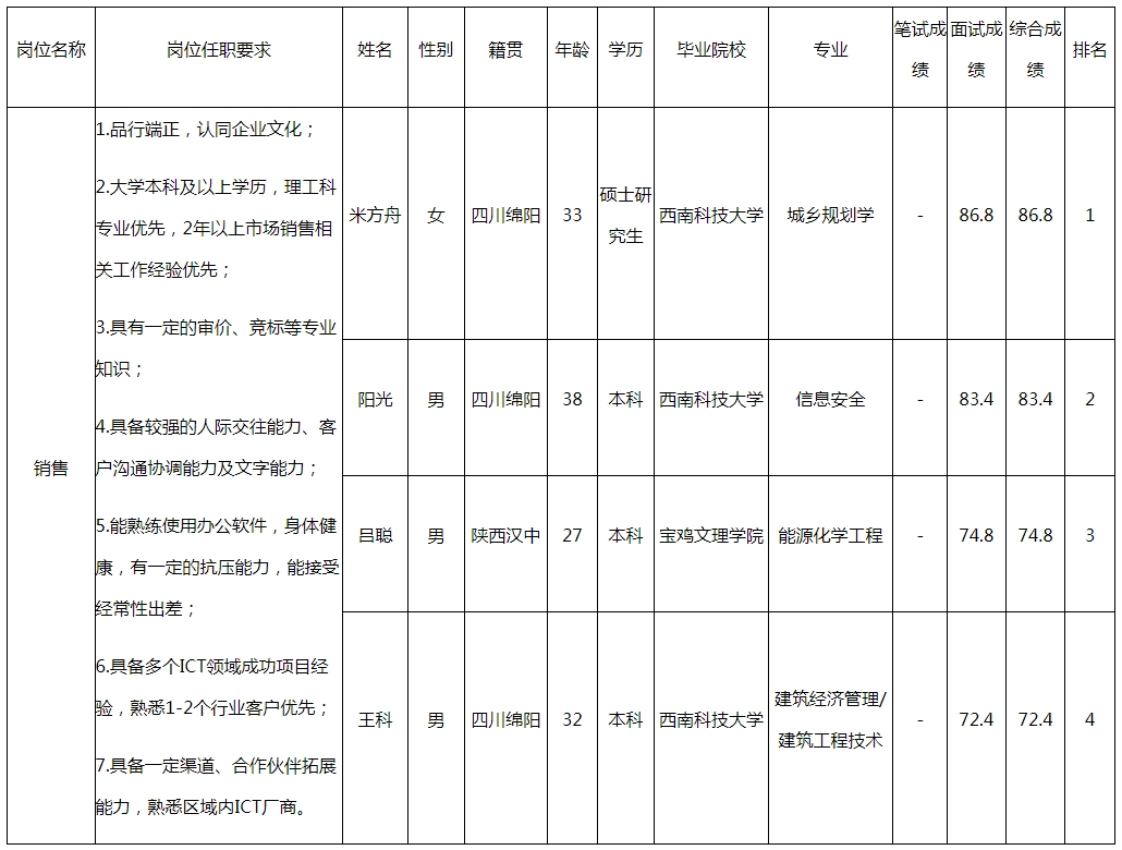 根據(jù)綿陽市智慧城市產(chǎn)業(yè)發(fā)展有限責(zé)任公司發(fā)布的招聘公告及招聘相關(guān)規(guī)定,經(jīng)筆試、面試等程序,現(xiàn)將筆試(面試)成績予以公示。