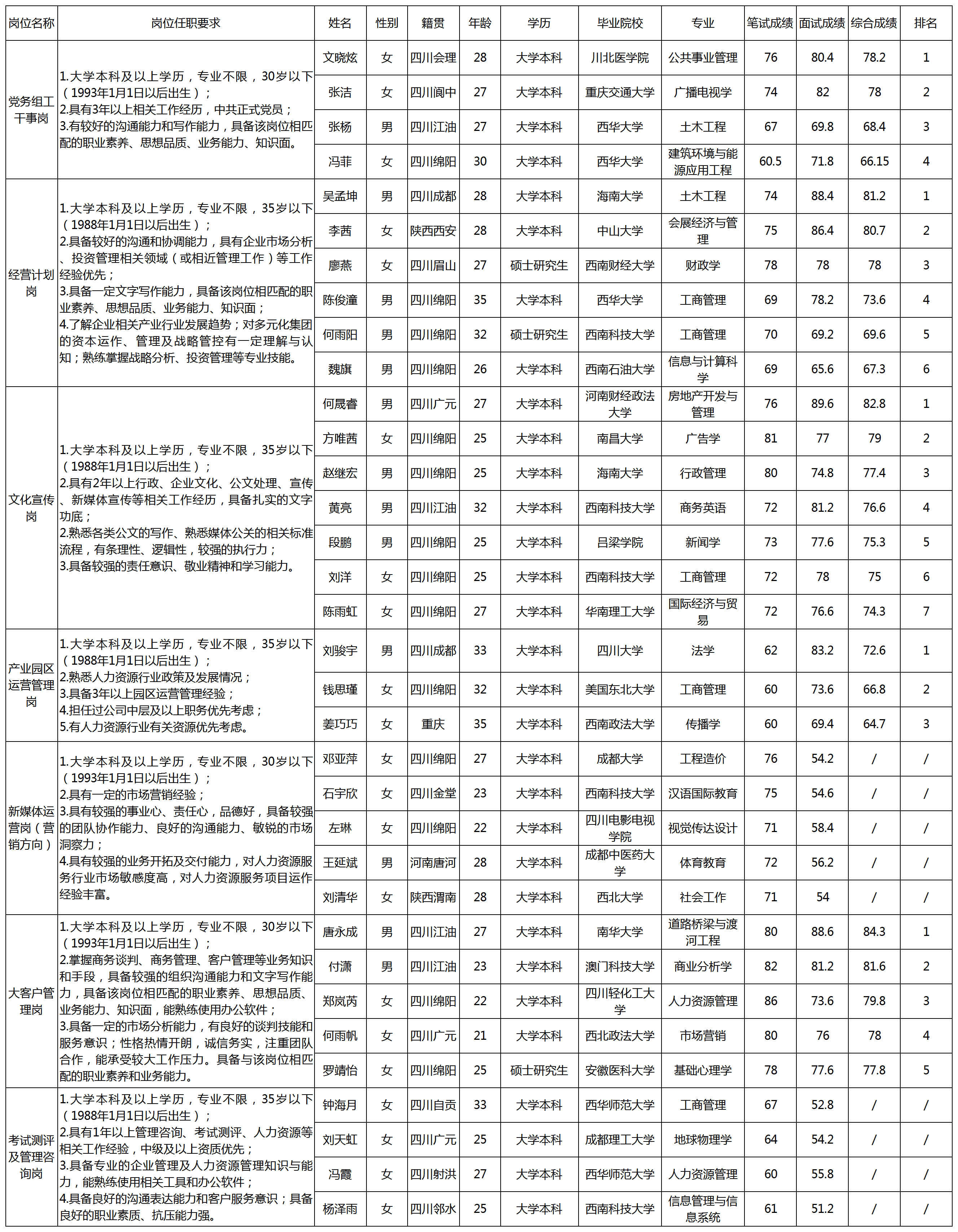 根據(jù)綿陽人才集團發(fā)布的招聘公告及招聘相關(guān)規(guī)定,經(jīng)筆試、面試等程序,現(xiàn)將筆試(面試)成績予以公示。