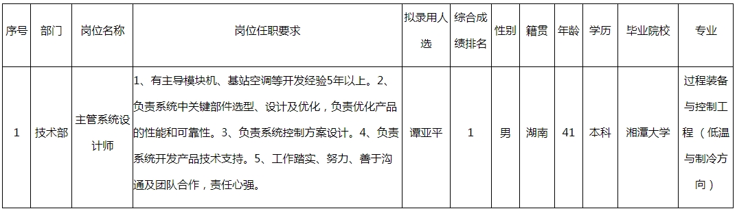 根據宏源地能熱泵科技(中山)有限公司發(fā)布的招聘公告及招聘相關規(guī)定,經筆試、面試、考察、體檢等程序,擬錄用譚亞平同志到技術部主管系統(tǒng)設計師工作,現(xiàn)予以公示,具體情況如下:
