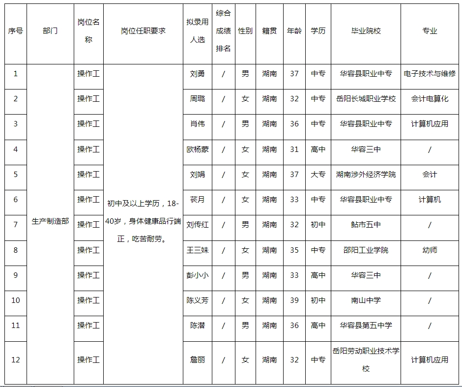 根據(jù)深圳長虹聚和源科技有限公司發(fā)布的招聘公告及招聘相關(guān)規(guī)定,經(jīng)筆試、面試、考察、體檢等程序,擬錄用以下同志到公司生產(chǎn)制造部工作,現(xiàn)予以公示,具體情況如下: