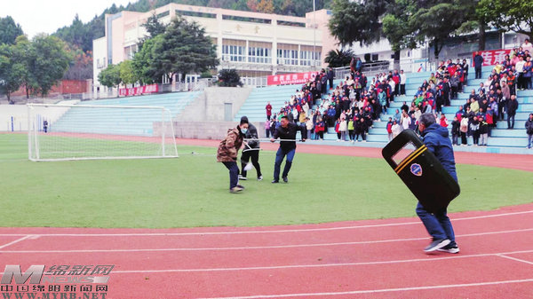 演練環(huán)節(jié)驚心動(dòng)魄,“恐怖分子”拿著兇器闖入校園,襲擊師生(如圖),學(xué)校立即拉響應(yīng)急警報(bào),撥打報(bào)警電話。接到報(bào)警后,市公安局仙海分局沉抗派出所民警立刻趕到現(xiàn)場(chǎng),聯(lián)合學(xué)校保安制服“恐怖分子”。整個(gè)演練過(guò)程緊張有序,展示出學(xué)校應(yīng)對(duì)突發(fā)事件的快速處理能力。