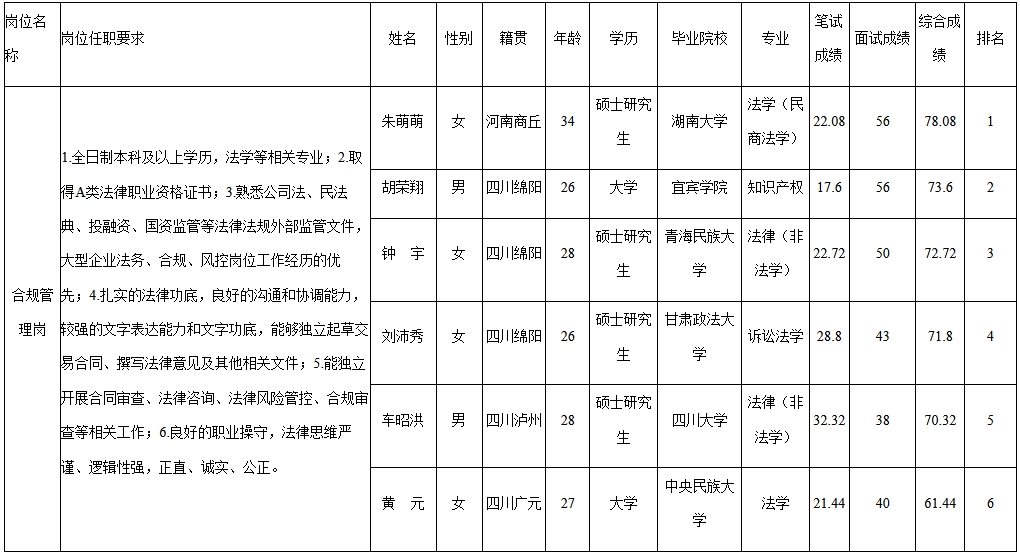根據(jù)綿陽燃氣集團有限公司發(fā)布的招聘公告及招聘相關規(guī)定,經筆試、面試等程序,現(xiàn)將綜合成績予以公示。