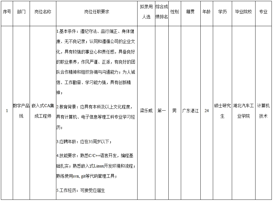 根據(jù)深圳市九洲電器有限公司發(fā)布的招聘公告及招聘相關規(guī)定,經(jīng)筆試、面試、考察、體檢等程序,擬錄用梁樂威同志到深圳市九洲電器有限公司工作,現(xiàn)予以公示,具體情況如下: