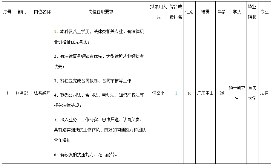 根據(jù)中山長(zhǎng)虹電器有限公司發(fā)布的招聘公告及招聘相關(guān)規(guī)定,經(jīng)面試、考察、體檢等程序,擬錄用何燊平同志到法務(wù)經(jīng)理工作,現(xiàn)予以公示,具體情況如下: