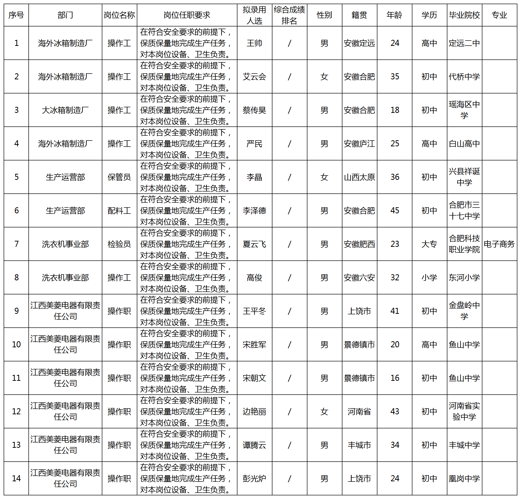 根據(jù)長(zhǎng)虹美菱股份有限公司發(fā)布的招聘公告及招聘相關(guān)規(guī)定,經(jīng)面試、體檢等程序,擬錄用王帥等8名同志到大冰箱制造廠等部門工作,現(xiàn)予以公示,具體情況如下: