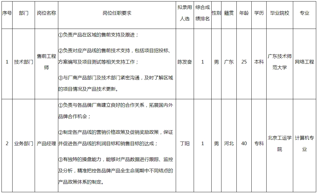 根據(jù)四川長虹佳華信息產(chǎn)品有限責(zé)任公司發(fā)布的招聘公告及招聘相關(guān)規(guī)定,經(jīng)筆試、面試、考察、體檢等程序,擬錄用陳發(fā)奮、丁陽同志到四川長虹佳華信息產(chǎn)品有限責(zé)任公司工作,現(xiàn)予以公示,具體情況如下: