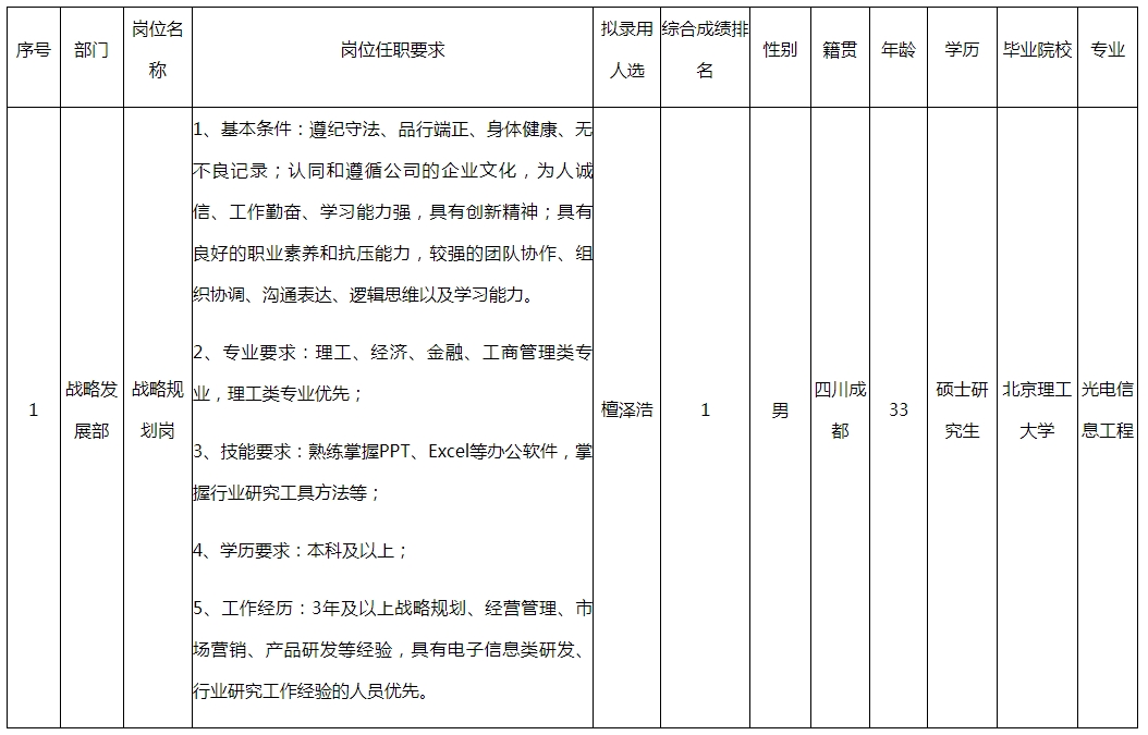 根據(jù)四川九洲投資控股集團(tuán)有限公司發(fā)布的招聘公告及招聘相關(guān)規(guī)定,經(jīng)筆試、面試、考察、體檢等程序,擬錄用檀澤浩同志到四川九洲投資控股集團(tuán)有限公司工作,現(xiàn)予以公示,具體情況如下: