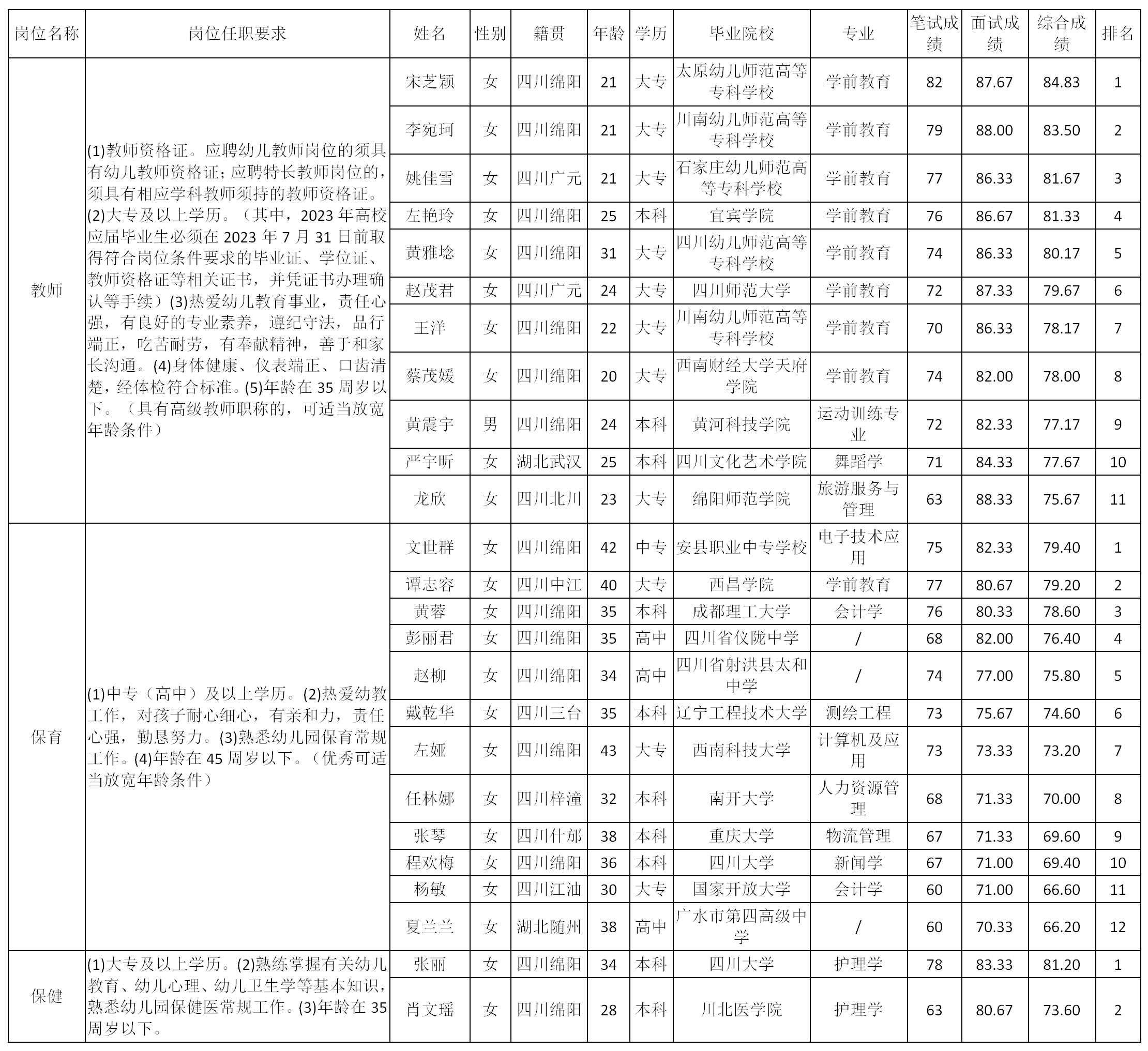 根據(jù)四川川幼春暉學(xué)前教育管理有限公司發(fā)布的招聘公告及招聘相關(guān)規(guī)定,經(jīng)筆試、面試等程序,現(xiàn)將筆試(面試)成績予以公示。