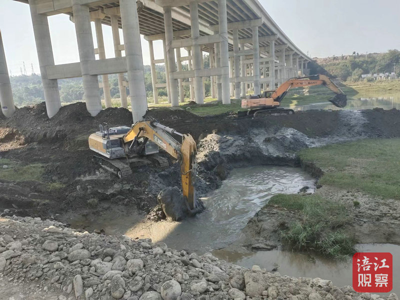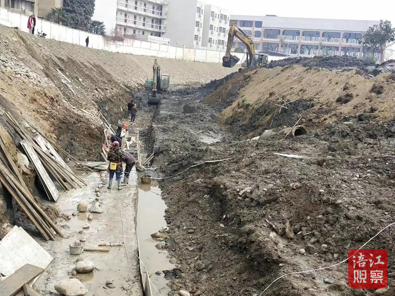 在麻柳河段,記者看到,挖掘機正在開挖齒槽、在河口處污水處理廠地段,工人們正在澆注混凝土擋墻。施工現(xiàn)場負責(zé)人陸珍權(quán)正在進行安全施工巡查。