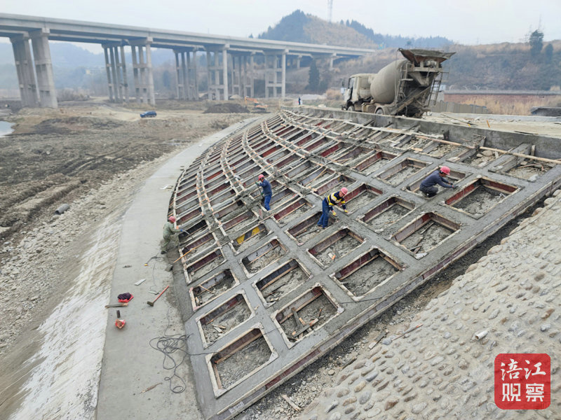 “目前,防汛方面的工程已經(jīng)完成。我們正在對趙家脊島右岸迎水面框格梁砼護坡、堤頂砼路面、裝防護欄桿,趙家脊島左岸豐谷段堤頂砼路面等進行全方位施工,預(yù)計今年4月底汛期來臨前,主體工程完工。5月31日前完成總體工程。”涪江右岸綿陽豐谷段防洪治理工程(一期)建設(shè)項目經(jīng)理艾軍向記者介紹。