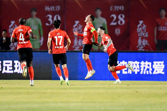 4月22日,長春亞泰隊(duì)球員塞爾吉尼奧(右二)在比賽中慶祝進(jìn)球。新華社記者 許暢 攝