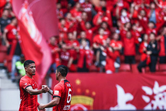 4月22日,上海海港隊(duì)球員蔣光太(左)與隊(duì)友蔡慧康在比賽中慶祝。新華社發(fā)