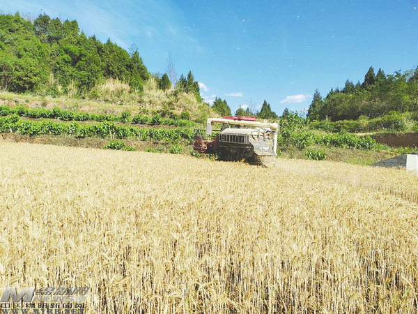 趁著天氣晴朗,雨臺村村委書記楊尚位與志愿者們相約一同到田地間收割麥子。田野上,聯(lián)合收割機(jī)正在金色的麥浪中來回馳騁(如圖),收割后的小麥留下了金色的麥茬,不多時(shí),一顆顆飽滿的麥粒從倉門流水般傾瀉而下,在拉糧車上堆起一座座麥山。