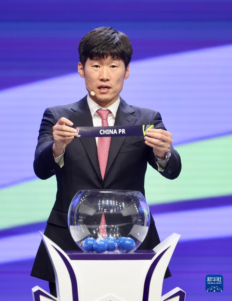 5月11日,韓國國家隊前隊長樸智星在抽簽儀式上展示中國隊的簽條。新華社發(fā)(亞足聯供圖)