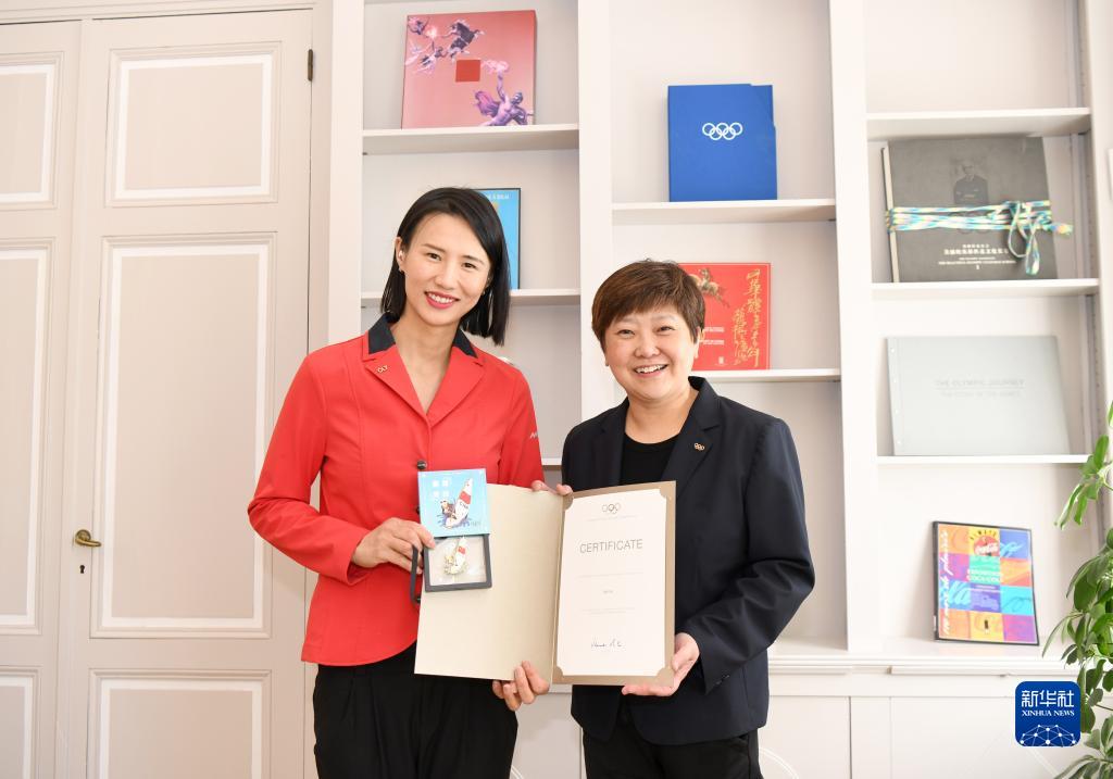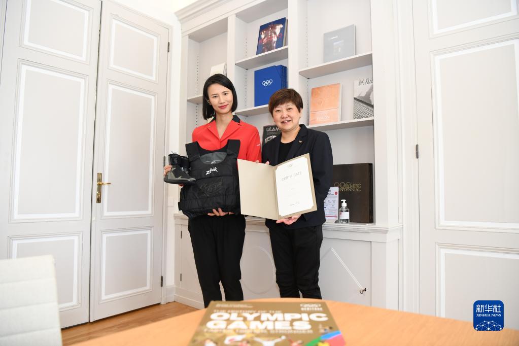 5月10日,在位于瑞士洛桑的國際奧委會總部,倫敦奧運會帆船金牌得主徐莉佳獲贈OLY徽章和證書。新華社記者 連漪 攝