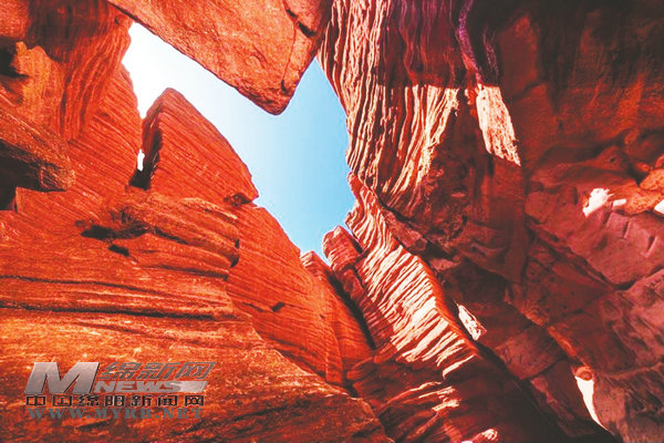 站在谷底抬頭即可看到峽壁的紋理有種變幻莫測的流動印記,宛若凝固的波浪,層層疊疊,多彩多姿。有的地方如烈日下奔流巖漿火焰般熾熱,但抬指一觸,卻凍如冰雪;有的地方如冷月下蕩漾波紋輕絲般柔軟,但伸手一摸,卻堅如磐石。