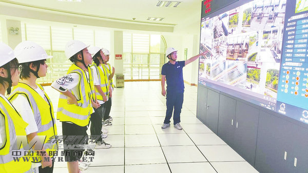 “污水是怎么一步步變清澈的呢?”“污水消毒的原理是什么?”……參觀之前,講解員為孩子們展示了處理前的污水與處理后的可排放水,并提出一些問(wèn)題。孩子們帶著問(wèn)題,跟隨講解員依次參觀了解了粗細(xì)格柵、沉砂池、生化處理、深度處理、消毒渠等設(shè)備。