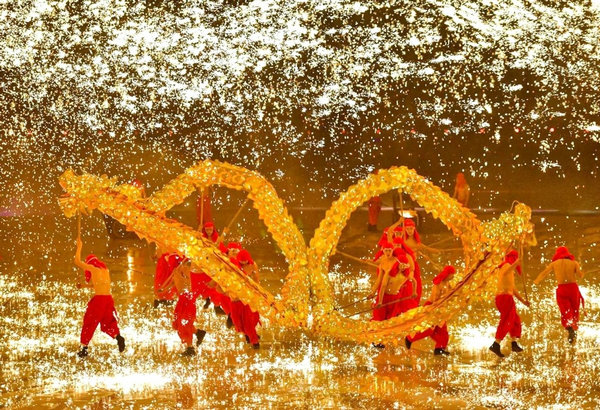1500℃的鐵水被拍打成鐵水花兒,像漫天流星劃過天際,火雨紛紛,星落遍地……晚上8時(shí)許,焰火龍表演將活動(dòng)推向了高潮,一條長(zhǎng)龍?jiān)谝粋€(gè)個(gè)赤膊舞龍人的手中翻騰著,構(gòu)成了一幅“人在火中舞,龍?jiān)诨鹬酗w”的壯美景致。在現(xiàn)場(chǎng),歡呼聲、喝彩聲此起彼伏,大家不時(shí)拿出相機(jī),記錄下這難忘的瞬間。