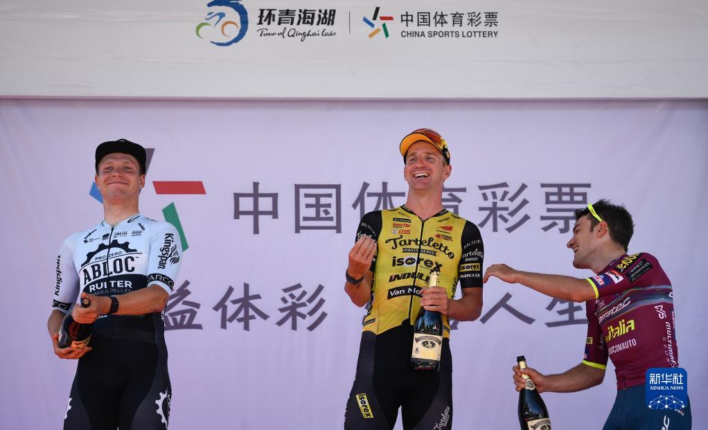 7月9日,獲得賽段前三的比利時(shí)塔特雷托-艾索雷斯車隊(duì)選手蒂莫蒂·杜邦(中)、荷蘭ABLOC CT車隊(duì)選手馬丁·普魯托(左)、意大利克羅蒂克車隊(duì)選手阿蒂利奧·維維亞尼在領(lǐng)獎(jiǎng)臺(tái)上慶祝。新華社記者 張龍 攝