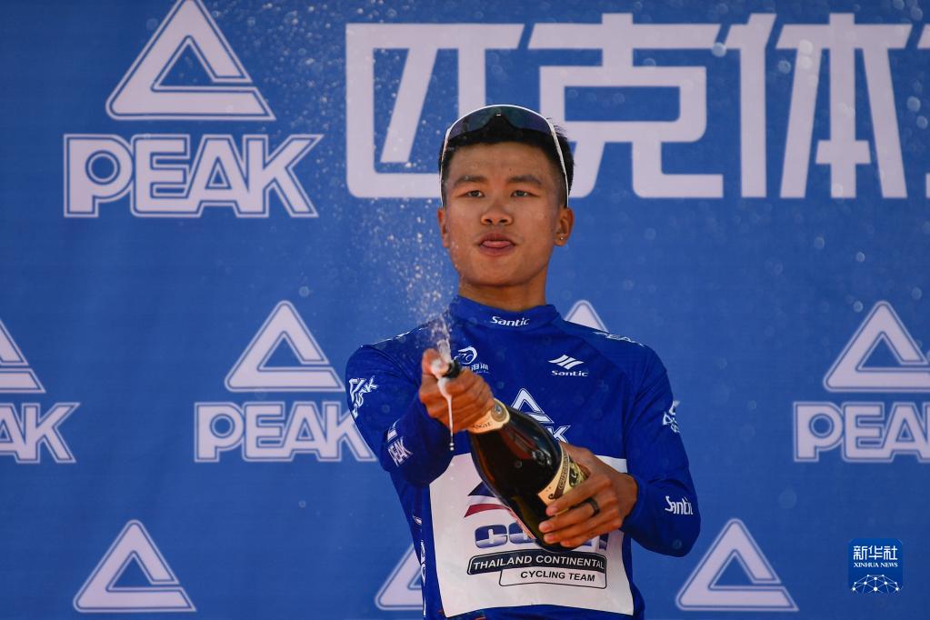 7月9日,泰國國家公路自行車隊(duì)選手塔納·柴亞松巴特身著代表亞洲最佳車手的藍(lán)衫在領(lǐng)獎(jiǎng)臺(tái)上噴灑香檳慶祝。新華社記者 張龍 攝