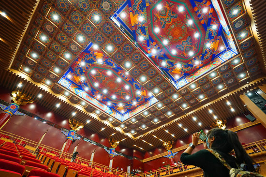 2021年7月9日,時(shí)隔28年,由北京市文化和旅游局、北京市國(guó)有資產(chǎn)經(jīng)營(yíng)有限責(zé)任公司共同出資,北京京劇院、北京市演出有限責(zé)任公司共同運(yùn)營(yíng)的吉祥大戲院重張啟幕。這座“藏身”于銀泰in88大廈7層、8層的空中戲院占地面積達(dá)4000平方米。乘電梯上樓,初入眼簾的前廳清新雅致,落地窗外可見王府井熙攘的人群與遠(yuǎn)處故宮、景山等古都風(fēng)光;劇場(chǎng)內(nèi),明清風(fēng)格古樸莊重,藻井彩繪繁復(fù)斑斕,傳統(tǒng)的“旋子彩繪”上增加了大量寓意吉祥的“萬字不到頭”圖案,與戲院的名字彼此呼應(yīng)。