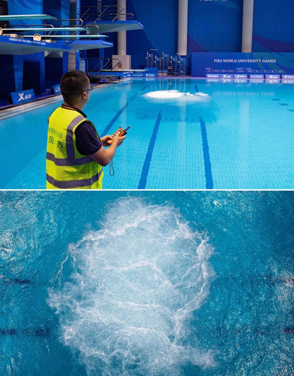 這是一張拼版照片。上圖為:7月22日,在簡陽文體中心游泳館,中國華西四川機司東來印象(簡陽文體中心)項目工作人員正在操作池底安全氣墊系統(tǒng)。下圖為:池底安全氣墊系統(tǒng)效果展示。該系統(tǒng)為確保跳水運動員安全,在氣體釋放時形成上升水流和側(cè)向水流增加水體的柔軟度和彈性,減緩人體在水中的降落速度,防止對運動員身體的傷害。新華社記者 江宏景 攝