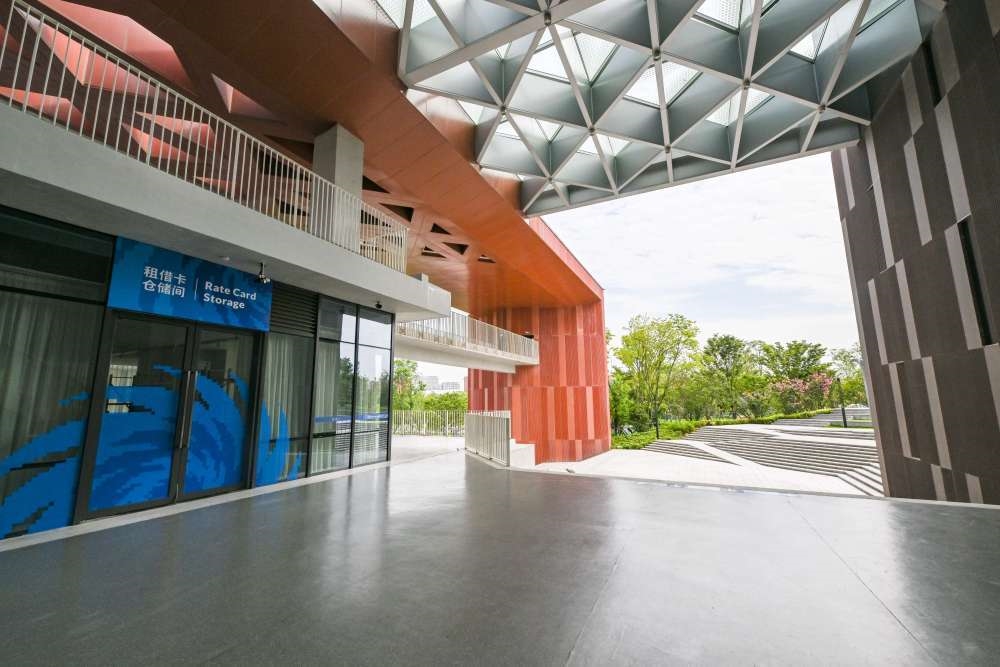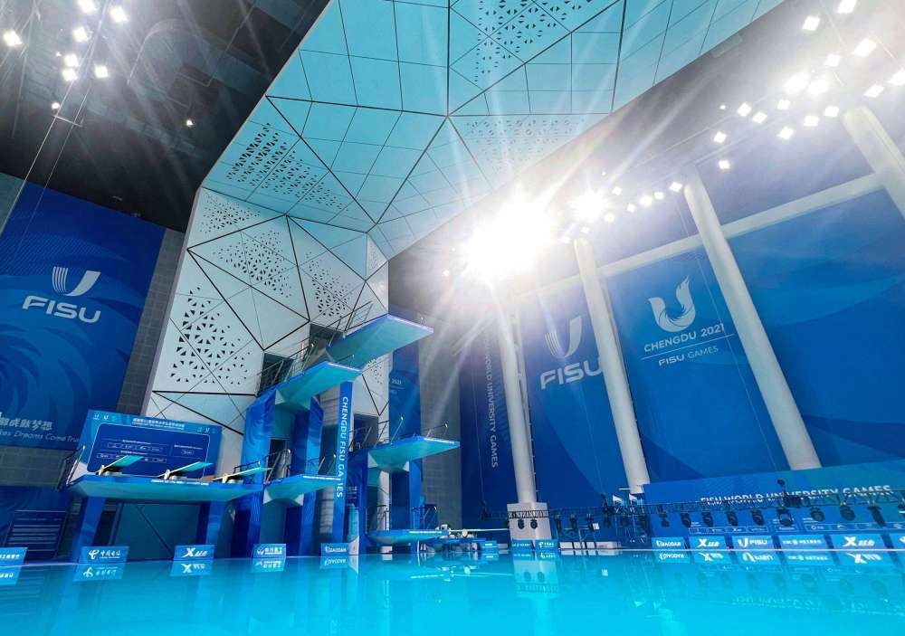 7月22日拍攝的簡陽文體中心游泳館跳水臺,它是我國唯一一座多折面異型清水混凝土跳臺,經(jīng)久耐用且節(jié)約資源。簡陽文體中心游泳館是成都大運會跳水項目的比賽場館。新華社記者 江宏景 攝
