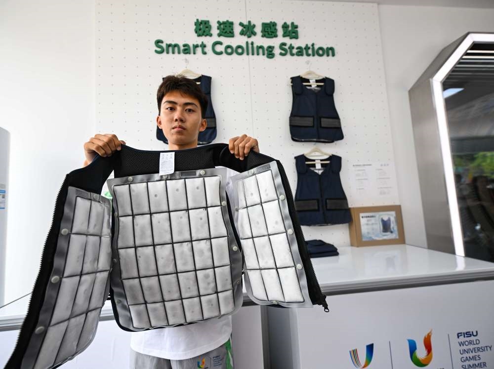 7月15日,在大運村科技服務(wù)工作站,工作人員在展示降溫冰背心。新華社記者 王曦 攝