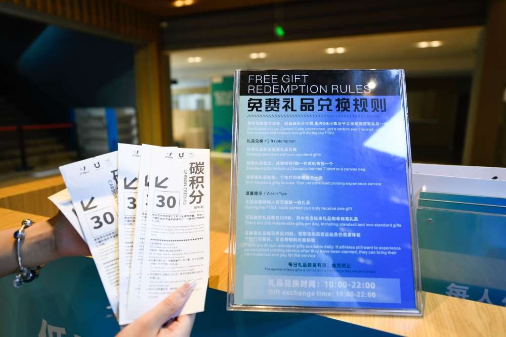 7月16日,在大運村藝術(shù)中心內(nèi),工作人員展示“低碳魔方”兌換的“碳積分”小票。新華社記者 胥冰潔 攝