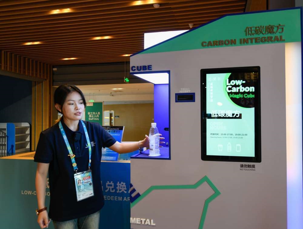 7月16日,在大運村藝術(shù)中心內(nèi),工作人員展示如何使用“低碳魔方”。將喝完的礦泉水瓶廢棄品投入“低碳魔方”可獲得“碳積分”小票,憑小票可兌換相應(yīng)的大運會禮品。新華社記者 胥冰潔 攝