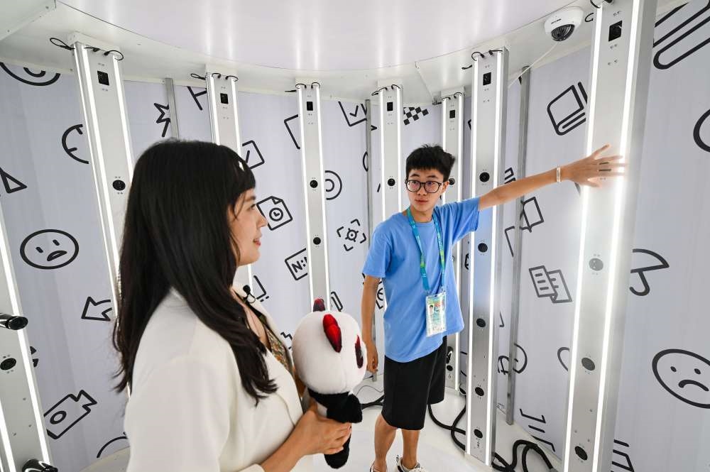 7月15日,在大運村科技服務(wù)工作站,參觀者在工作人員引導下體驗3D攝影。新華社記者 王曦 攝