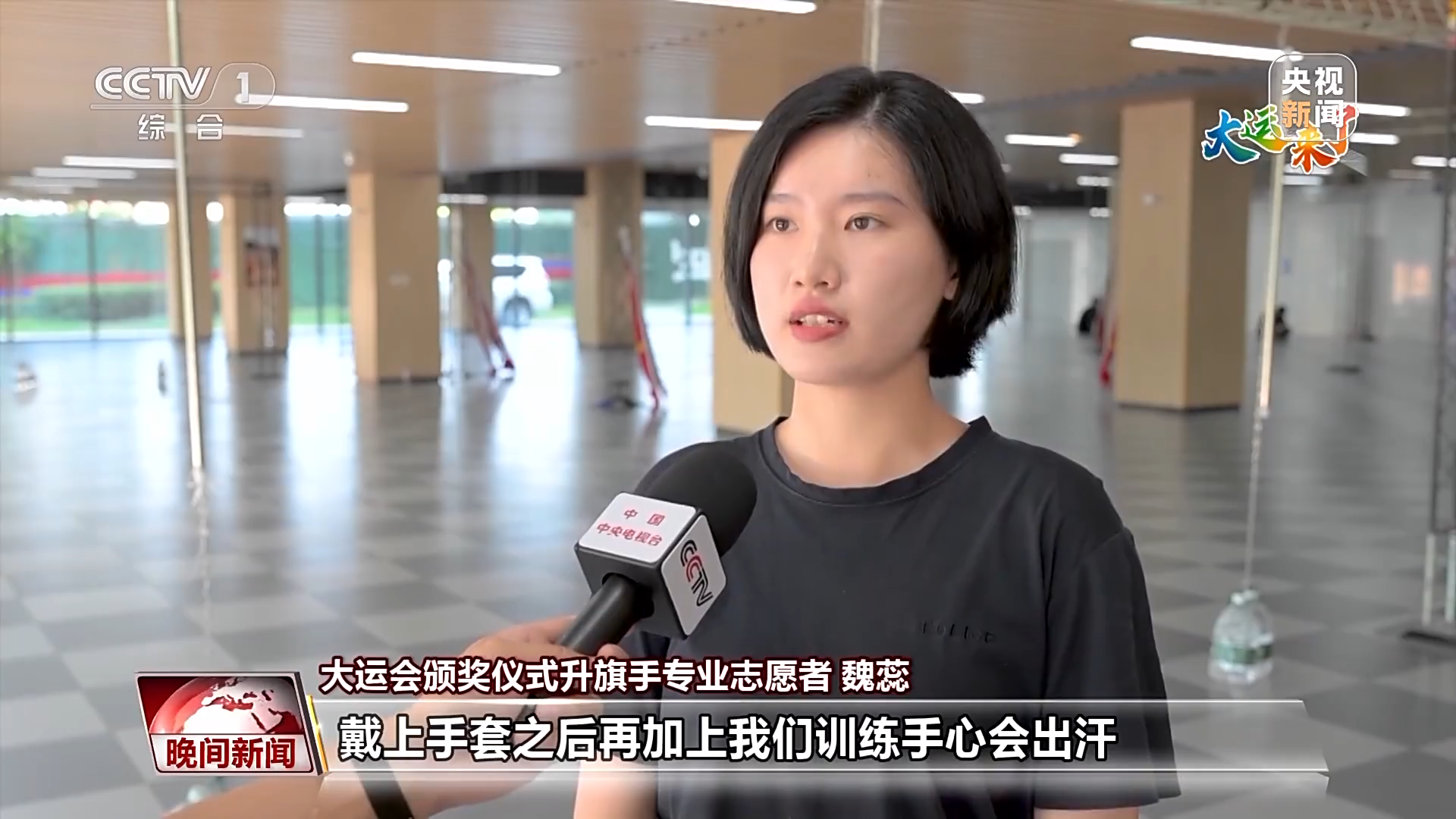 成都大運會頒獎儀式升旗手專業(yè)志愿者 魏蕊:戴上手套之后,再加上我們訓練手心會出汗,對扣子還有旗的敏銳程度就會降低,很緊張,怕自己做不好拖團隊的后腿?;厝ブ笪揖湍昧艘粋€類似的東西一直解、扣、解、扣,重復練。成百上千次肯定是有的。